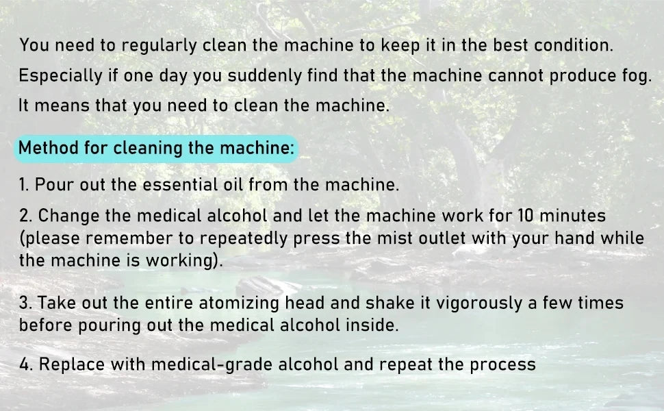 This machine is suitable for oil soluble essential oil with a concentration of 5% - 60%. Directly add essential oil to the machine without adding water.