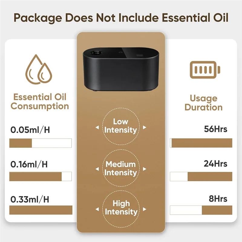 [3 Intensity Cycle Mode]Waterless diffusers for essential oils has three intensity modes. High Mode:Mist 60s,Pause 1min. Medium Mode:Mist 40s,Pause 3mins. Low Mode:Mist 20s,Pause 5mins. You can choose the mode that suits your needs for work, sleep, entertainment, sport, spa,etc.