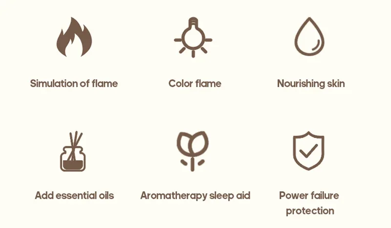 Function: aroma oil atomization, no intelligent scheduled water stop, colorful environmental lighting & realistic flame night light