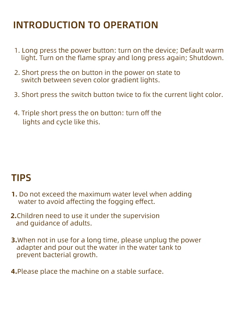 1. Do not exceed the maximum water level when adding water to avoid affecting the fogging effect.